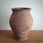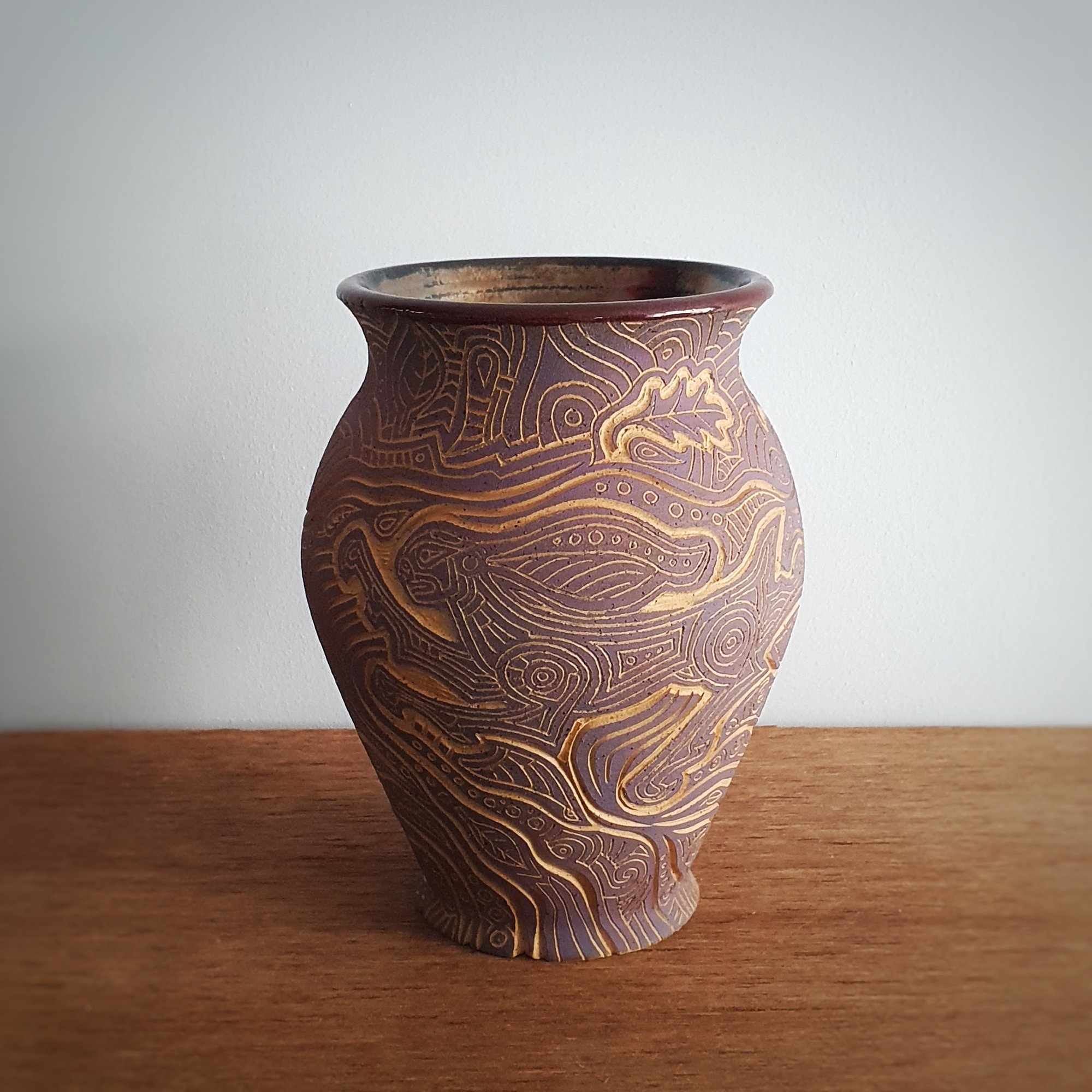 Hand-thrown with a toasted stoneware clay, hand carved and etched. Inside is glazed to a chrome finish.