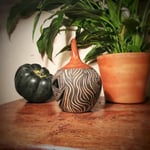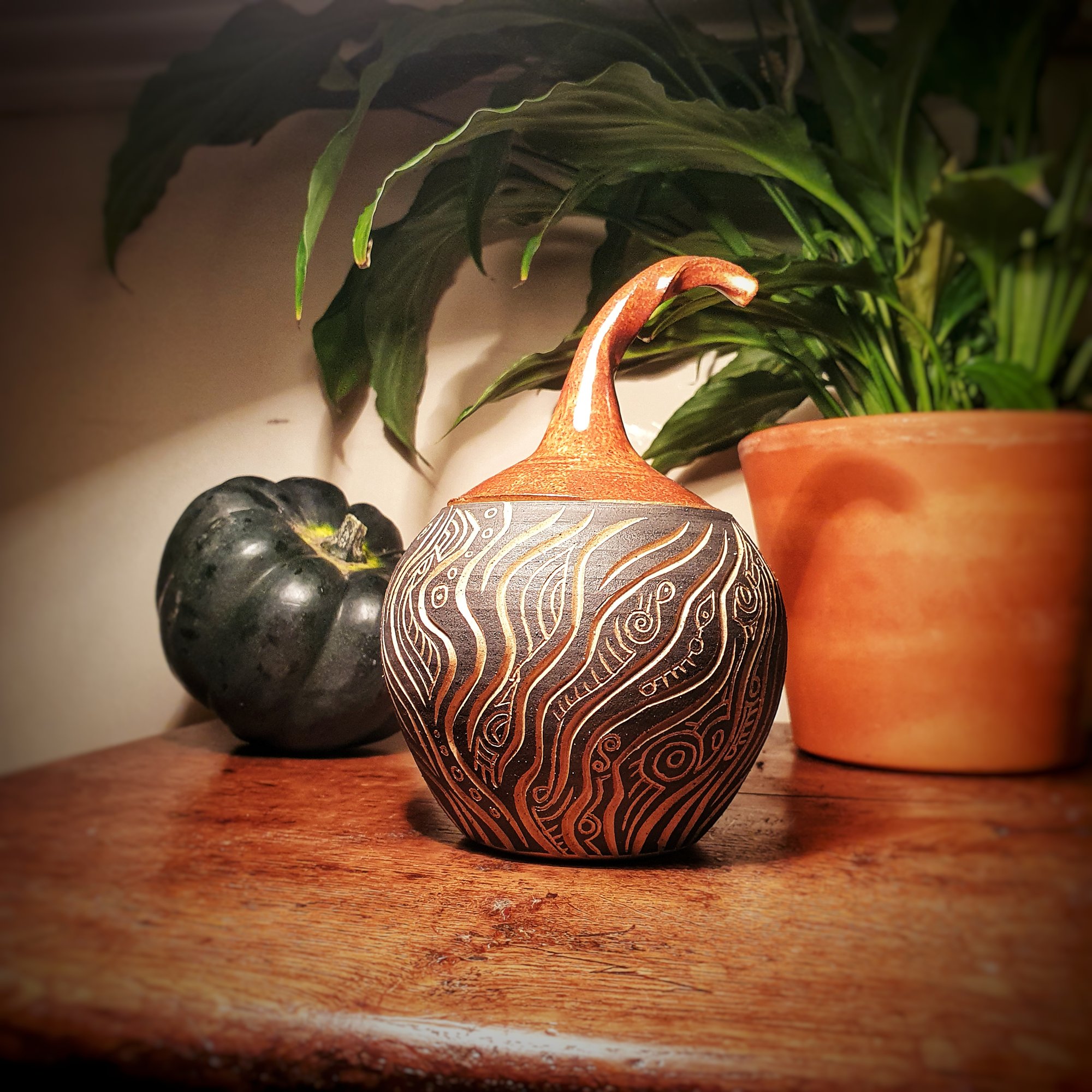 Hand thrown with stoneware clay, coated with black underglaze to contrast the hand carved neolithic style patterns inspired by nature. The lid is glazed with a glossy finish which sets off the sgraffito nicely. Fired to 1220° Celsius.