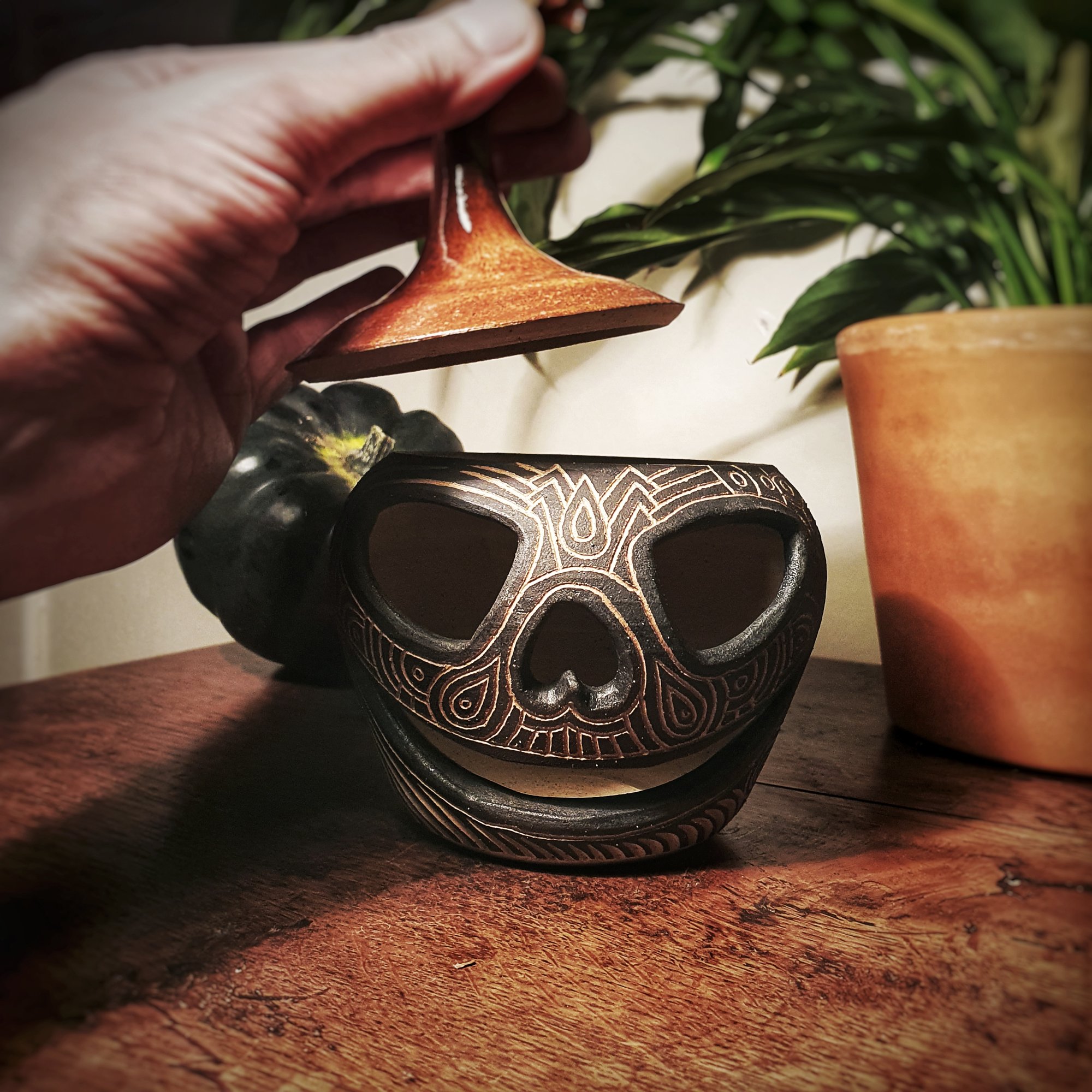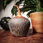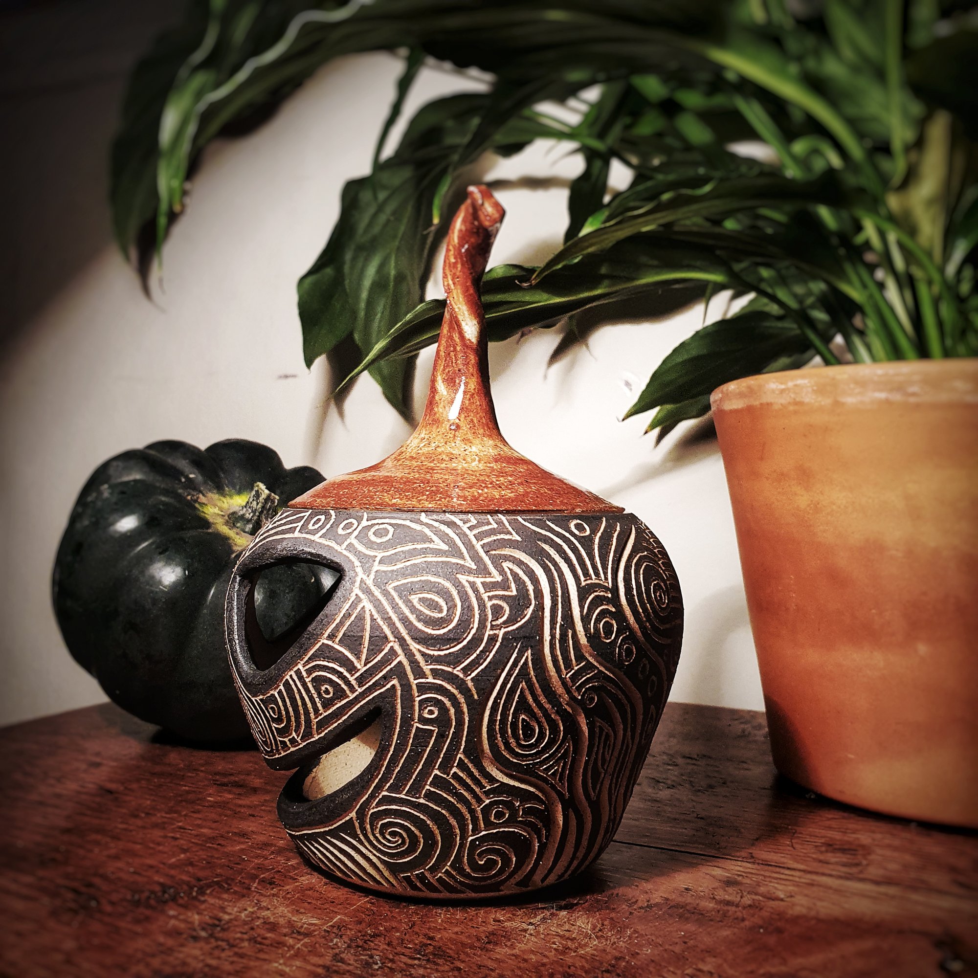 Sgraffito Pumpkin lantern. Hand thrown with stoneware clay, coated with black underglaze to contrast the hand carved neolithic style patterns inspired by nature. The lid is glazed with a glossy finish which sets off the sgraffito nicely. Fired to 1220° Celsius.