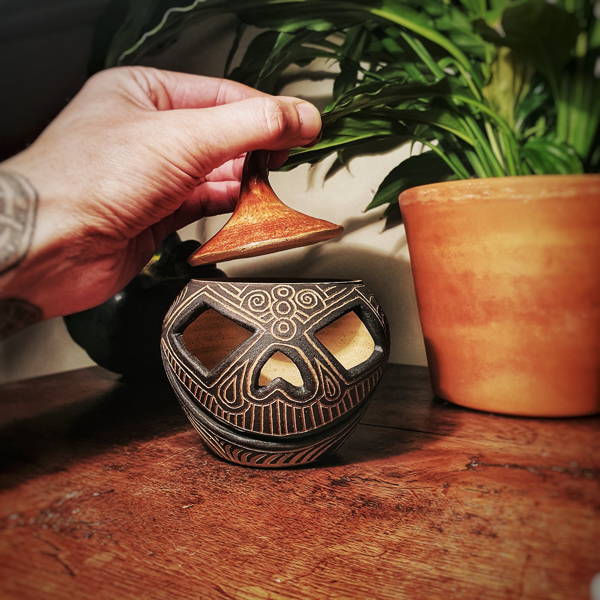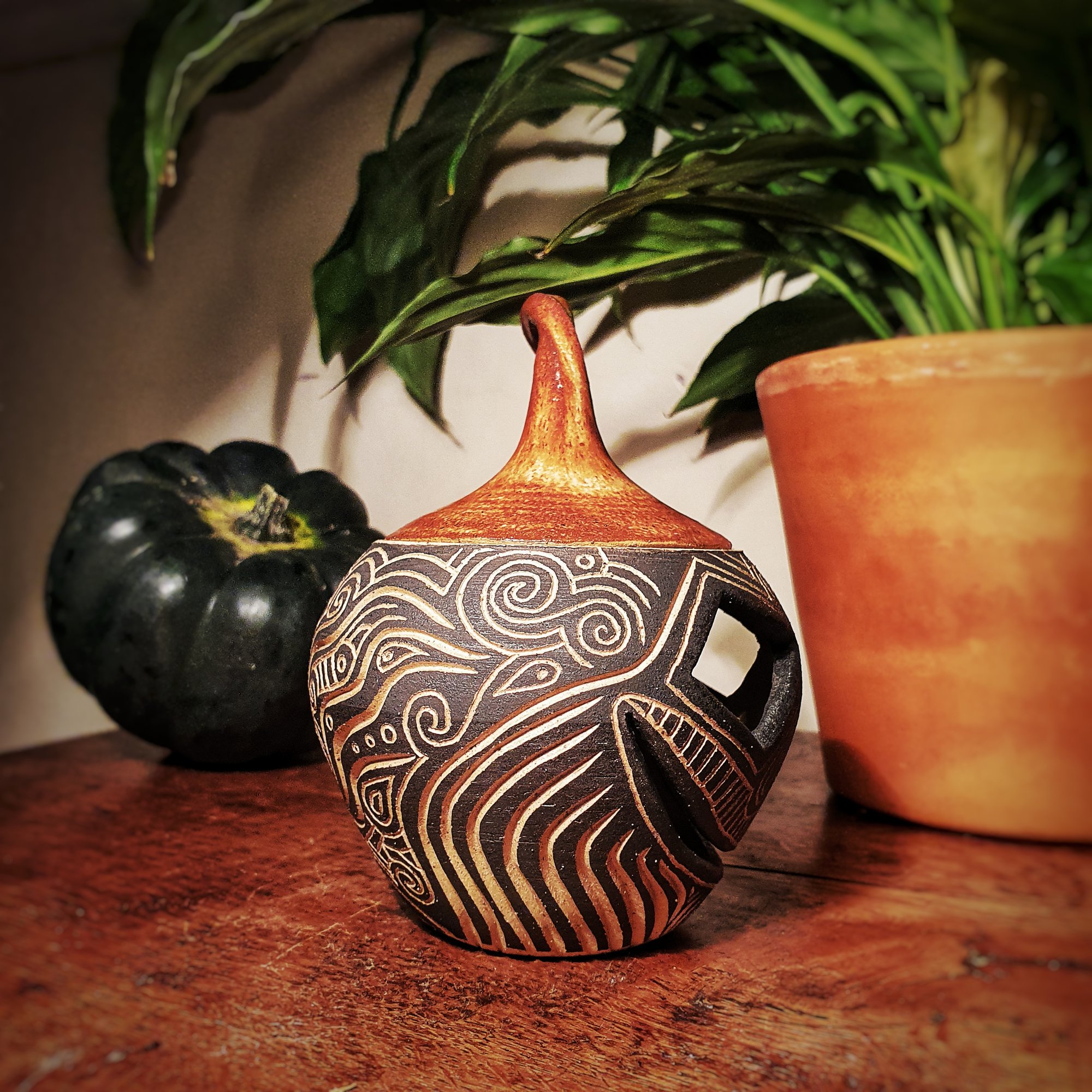 Sgraffito Pumpkin lantern. Hand thrown with stoneware clay, coated with black underglaze to contrast the hand carved neolithic style patterns inspired by nature. The lid is glazed with a glossy finish which sets off the sgraffito nicely. Fired to 1220° Celsius.