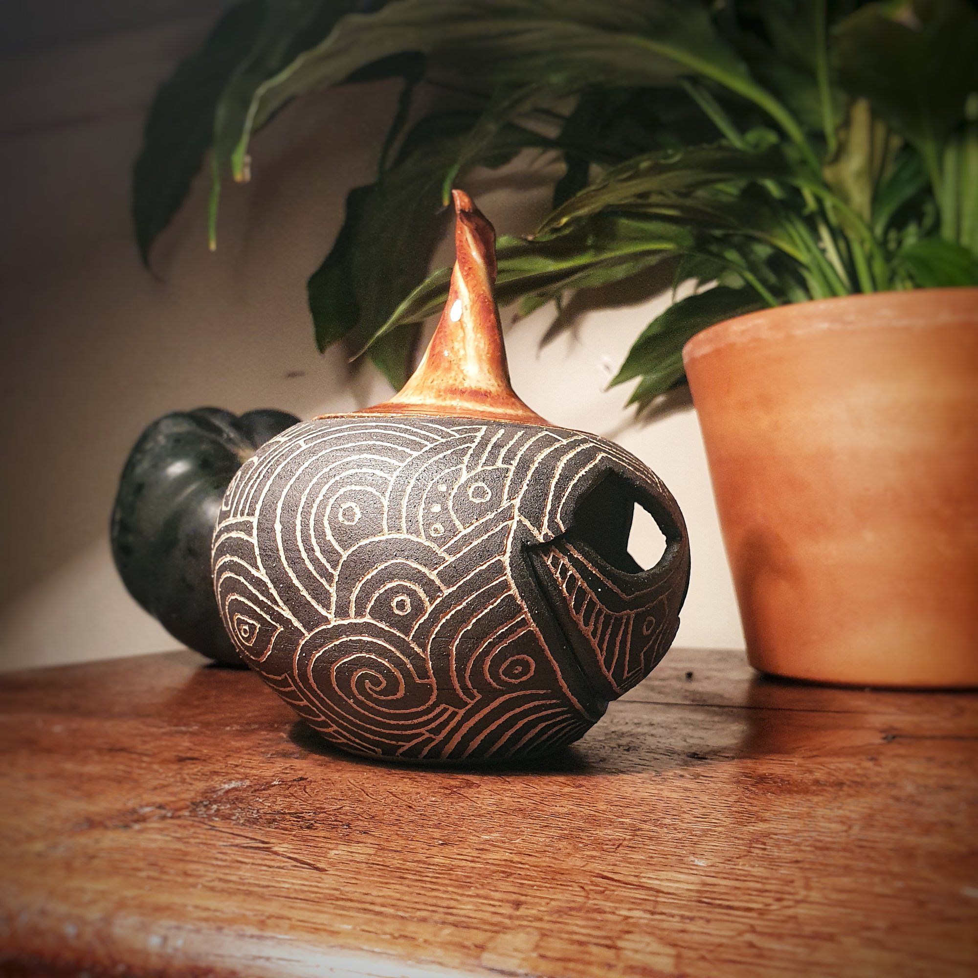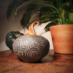 Hand thrown with stoneware clay, coated with black underglaze to contrast the hand carved neolithic style patterns inspired by nature. The lid is glazed with a glossy finish which sets off the sgraffito nicely. Fired to 1220° Celsius.