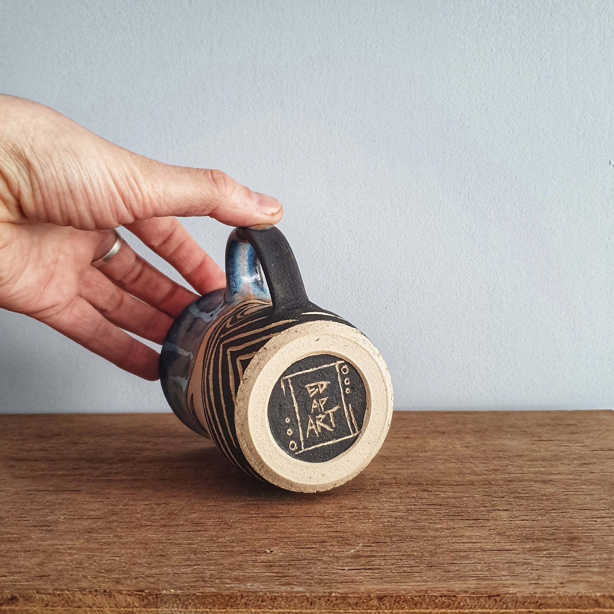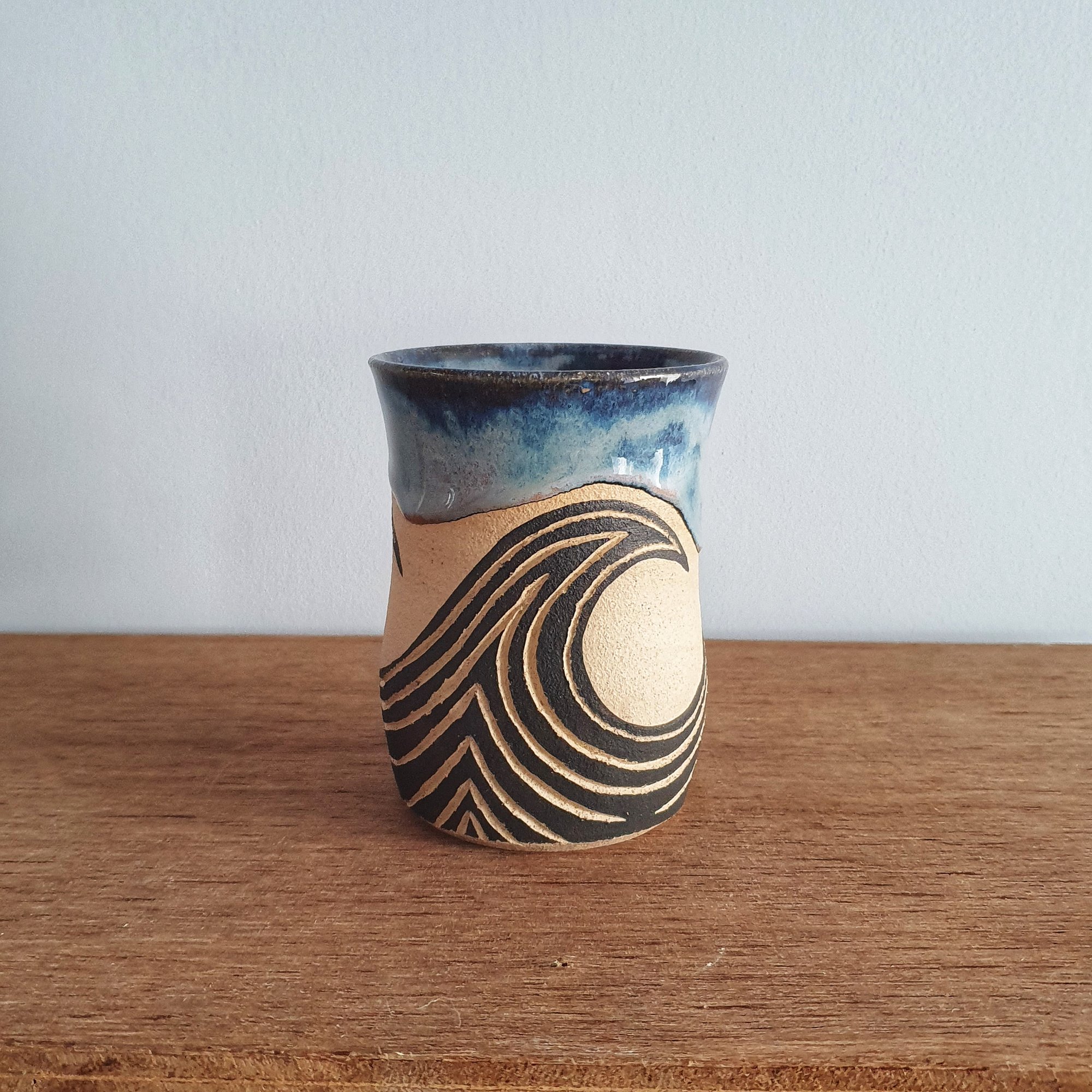 Hand-thrown with an Irish white stoneware clay with hand painted and carved ocean waves, for those of you that always hear the ocean calling! Although microwave and dishwasher safe, handwashing is recommended to enhance the quality and life span of your piece. Remember, all the oldest surviving ceramics never got this modern treatment!