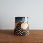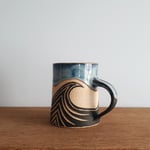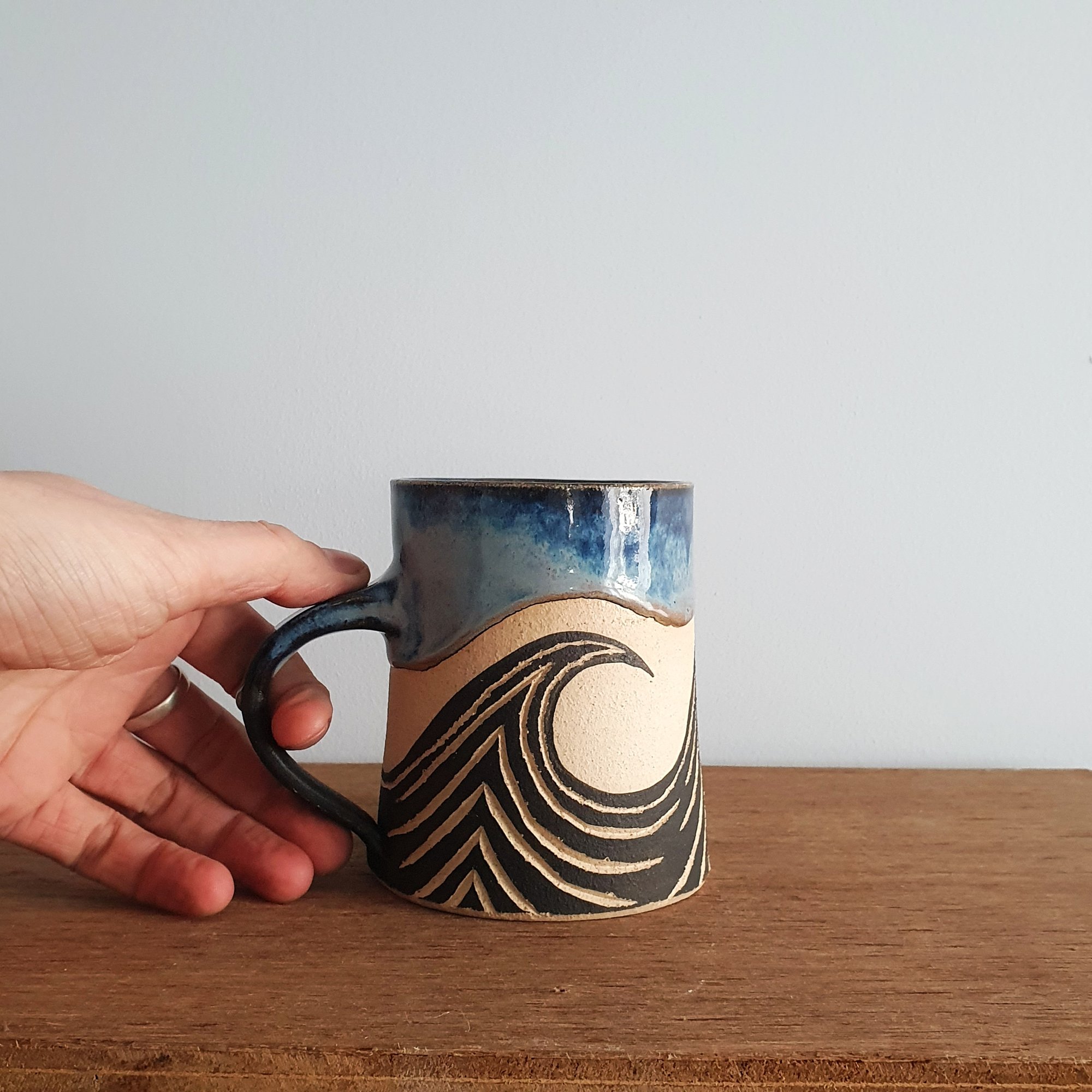 Hand-thrown with an Irish white stoneware clay with hand painted and carved ocean waves, for those of you that always hear the ocean calling! Although microwave and dishwasher safe, handwashing is recommended to enhance the quality and life span of your piece. Remember, all the oldest surviving ceramics never got this modern treatment!